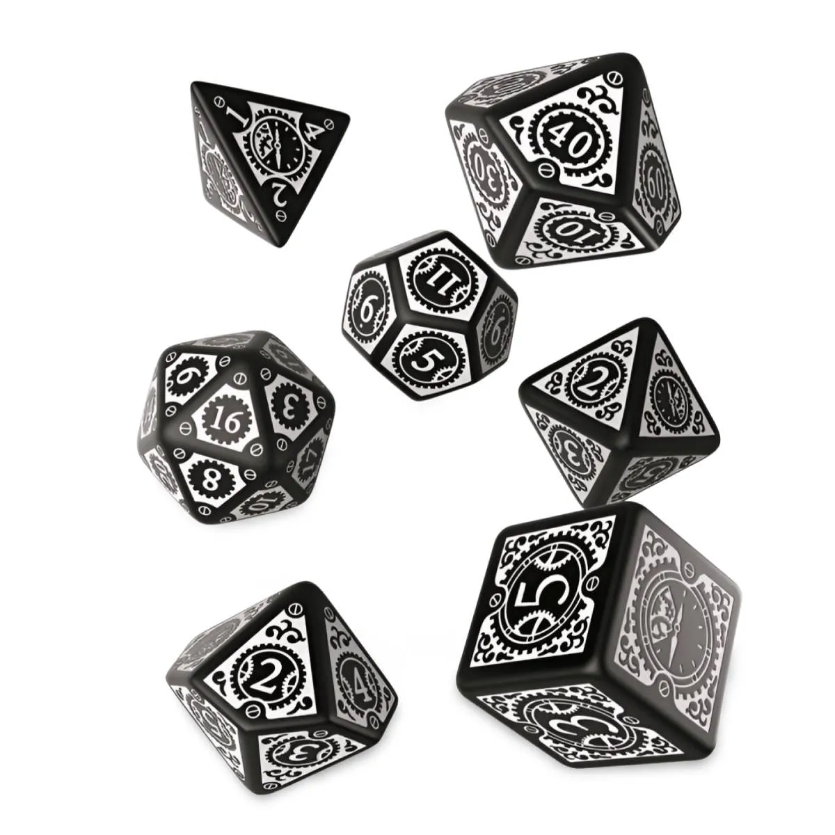 El Steampunk Clockwork White & Black Dice Set de Q-Workshop es un conjunto de siete dados poliédricos con intrincados diseños de engranajes y relojería, perfecto para añadir un toque steampunk a tus partidas de rol.
