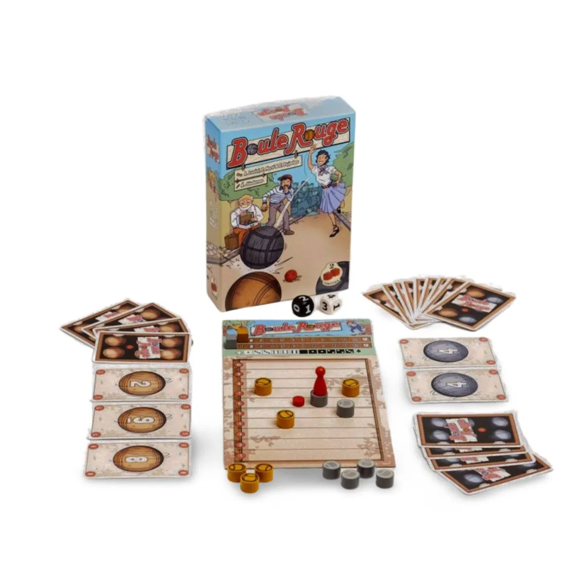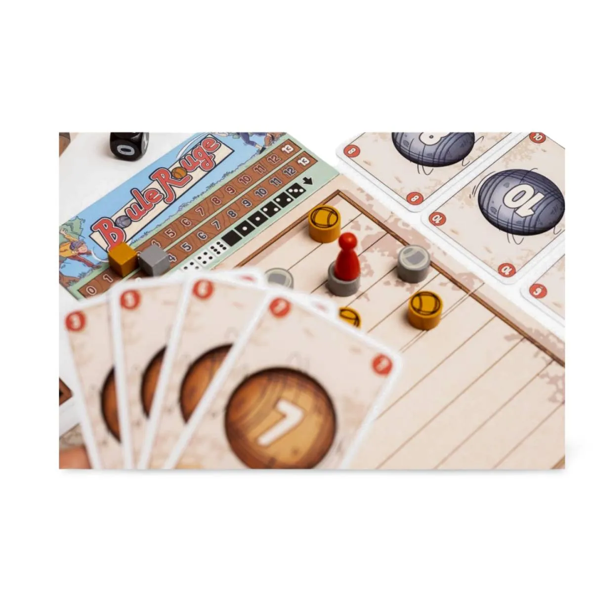 Boule Rouge es un juego de cartas para 2 a 6 jugadores que recrea la experiencia de la petanca. Los jugadores, divididos en equipos, utilizan cartas y dados para acercar sus bolas al boliche, combinando estrategia y azar en partidas de 15 a 25 minutos.