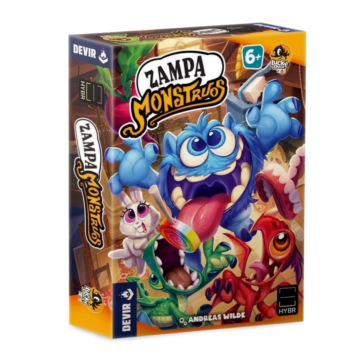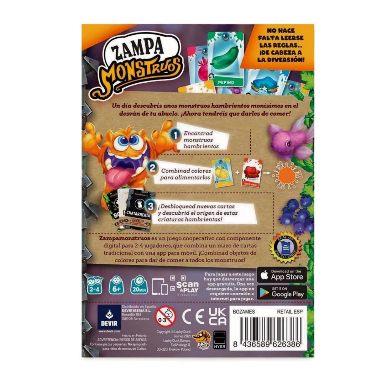 Zampa Monstruos es un juego de cartas cooperativo donde los jugadores combinan colores para alimentar a simpáticos monstruos, utilizando una aplicación móvil para mezclar los tonos correctamente.