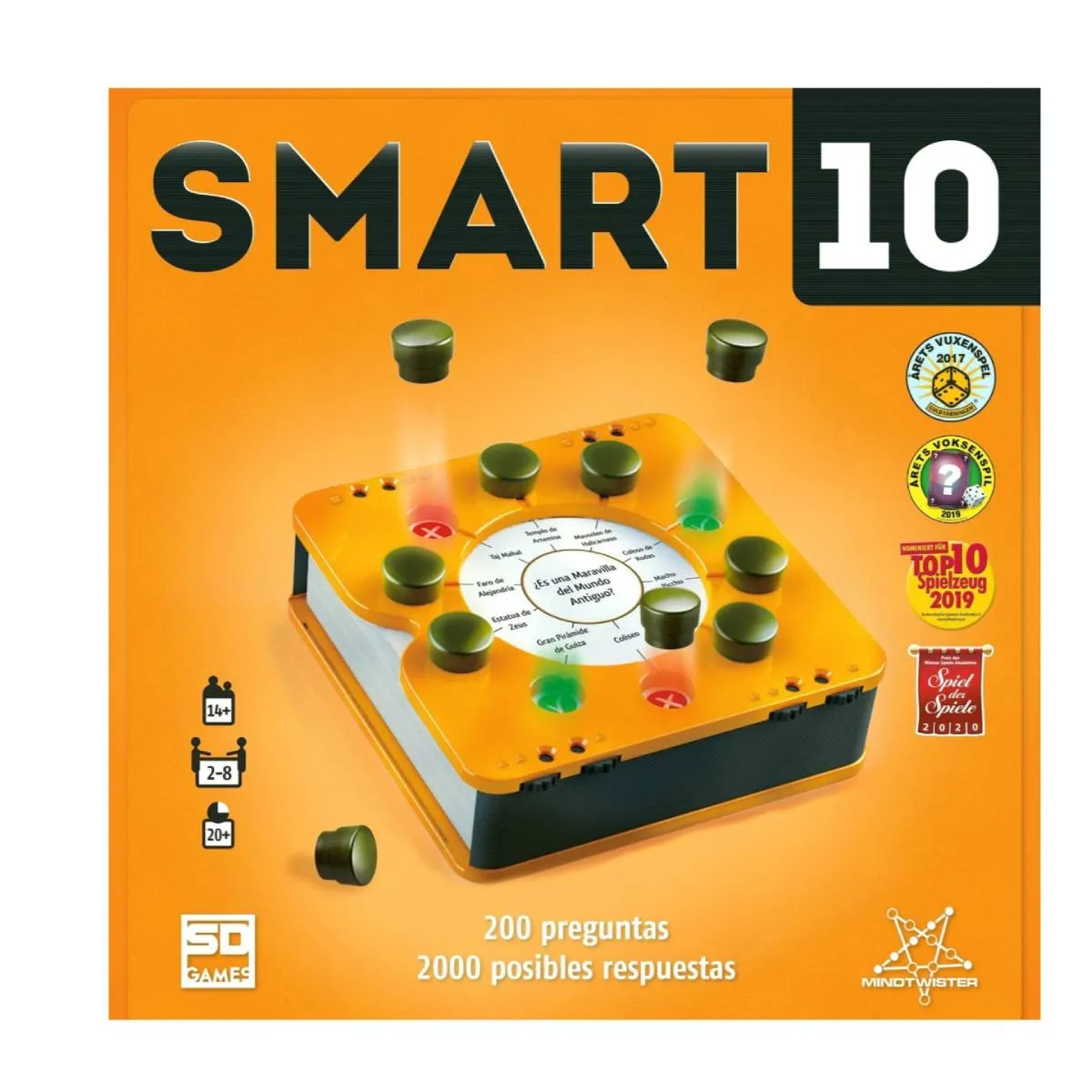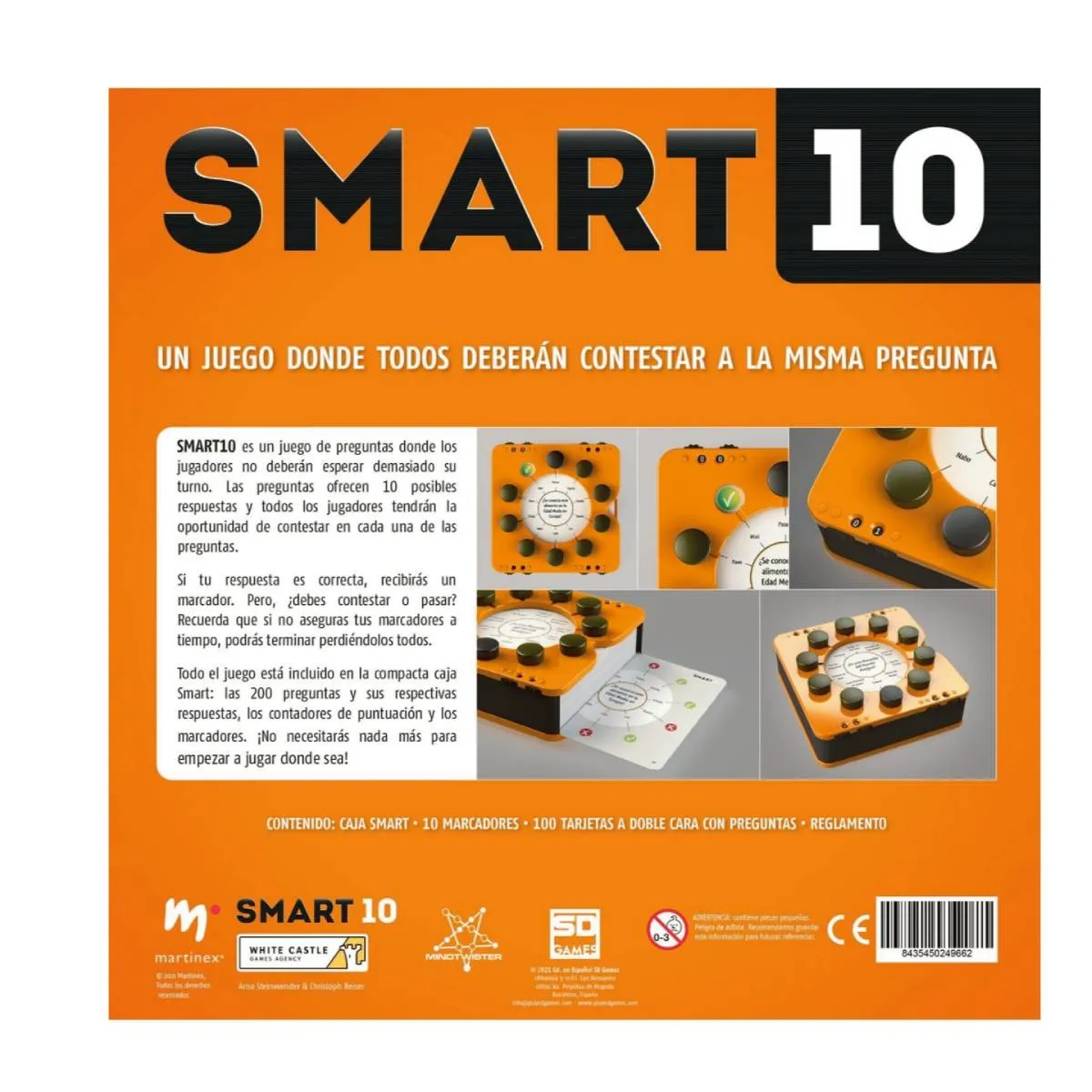 Smart 10 es un juego de preguntas que te desafía a estar siempre alerta y a responder sin esperar tu turno. Cada pregunta presenta 10 posibles respuestas, y todos los jugadores tienen la oportunidad de contestar al mismo tiempo. La mecánica es simple pero trepidante: si aciertas, ganas un marcador; sin embargo, debes decidir rápidamente si arriesgas tu respuesta o prefieres pasar, porque si no aseguras tus marcadores a tiempo, podrías perderlos. Con 200 preguntas y respuestas, además de contadores de puntuación y marcadores, todo incluido en una caja compacta, Smart 10 es perfecto para disfrutar en cualquier lugar. Su dinámica ágil y llena de decisiones instantáneas convierte cada partida en una experiencia entretenida y desafiante que pondrá a prueba tu rapidez mental en cada ronda.