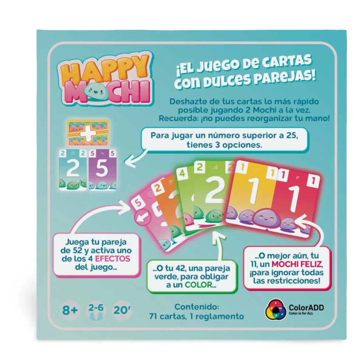 ¡Happy Mochi! Un juego que combina la dulzura del postre japonés con la emoción de deshacerse de cartas lo más rápido posible. Diseñado por Johan Benvenuto y Romaric Galonnier, este juego de cartas para 2 a 6 jugadores a partir de 8 años te desafía a formar parejas de cartas sin reorganizar tu mano. Las reglas son sencillas: juega tus cartas en pares adyacentes y sé el primero en quedarte sin ellas. Pero cuidado, la tentación de reorganizar tu mano puede ser fuerte, y resistirse es parte del desafío. Con partidas de 15 a 30 minutos, Happy Mochi es perfecto para una sesión rápida de diversión en familia o con amigos. Además, su diseño colorido y temática gastronómica lo convierten en una delicia visual.