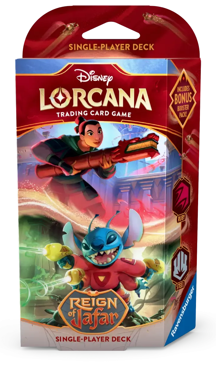 El mazo Ruby/Steel de Disney Lorcana: Reign of Jafar es un mazo preconstruido de 60 cartas, diseñado para jugadores que desean sumergirse en el juego con una combinación de personajes valientes y resistentes. Este mazo incluye dos cartas foil de los personajes destacados en la portada, junto con 11 fichas de juego, un reglamento de inicio rápido y un sobre de refuerzo con 12 cartas aleatorias.