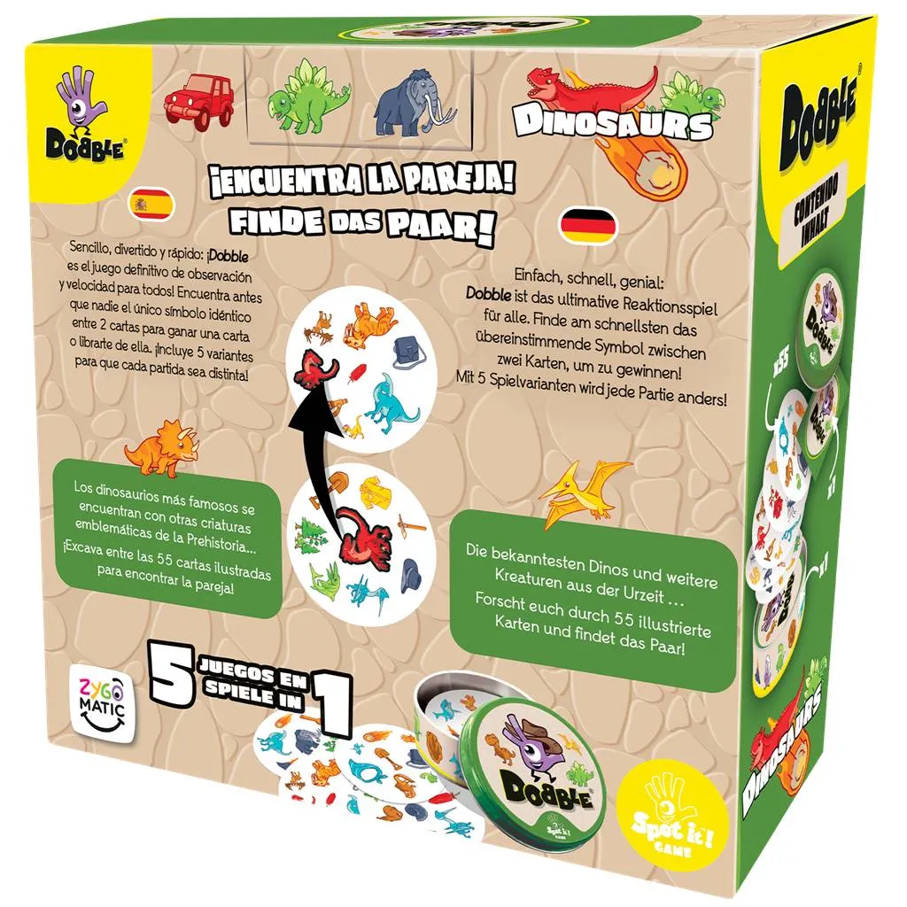 Con un mazo de 55 cartas repleto de dinosaurios esquivos y feroces, tu misión es encontrar el único icono coincidente entre tu carta y la de un oponente antes de que tu marcador ruja. Cada mini juego ofrece objetivos distintos: robar cartas, descartarlas o quedarte sin ellas para ganar.