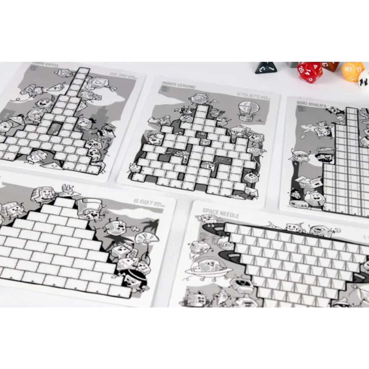 Cada jugador debe decidir cuánto se quiere arriesgar en su carrera a la cima. Los dados de 4, 6, 8, 12 y 20 caras son muy caprichosos y los jugadores deben escoger qué números apuntan en sus pizarras de desafío. Pueden anotar unos dados y renunciar a otros o incluso sumar la cifra de varios de ellos, pero la condición indispensable a la hora de escalar en el desafío es que el número de una casilla debe ser siempre IGUAL o MAYOR al de la casilla inferior.