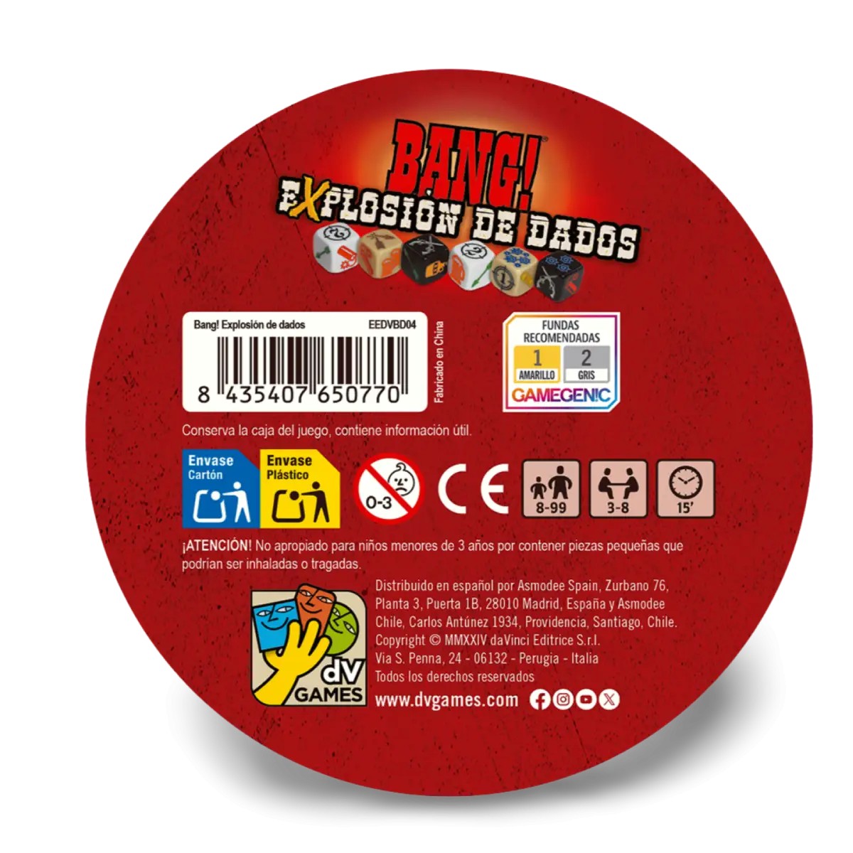 Bang! Explosión de Dados es un juego de roles ocultos donde los dados deciden si disparas, te curas o te explotas a ti mismo, mientras intentas deducir quiénes son tus aliados y enemigos. Con partidas rápidas, caos controlado y muchas risas, es perfecto para grupos que buscan diversión en el salvaje oeste.