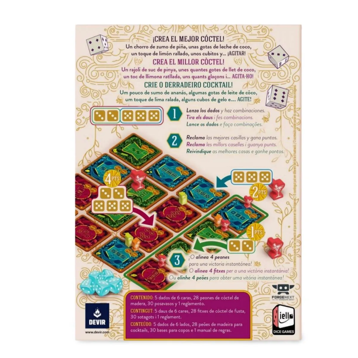 Piña Coladice es un dinámico juego de dados donde de 2 a 4 jugadores compiten por preparar los mejores cócteles, combinando suerte y estrategia en partidas rápidas y refrescantes.