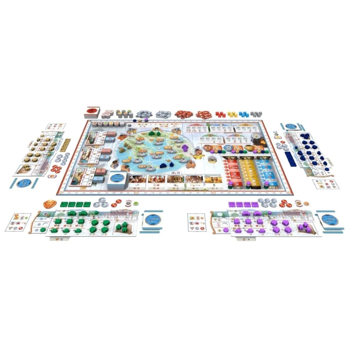 A lo largo de cuatro rondas, construirás ciudades, monumentos y rutas comerciales, mientras enfrentas desafíos como los enigmáticos Pueblos del Mar. La mecánica central se basa en la asignación de dados y la programación de acciones, donde los valores de los dados determinan la potencia de tus movimientos. Además, las cartas de Decreto ofrecen habilidades únicas que pueden inclinar la balanza a tu favor.