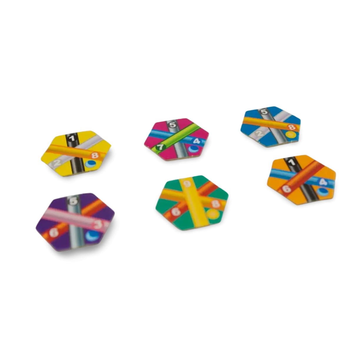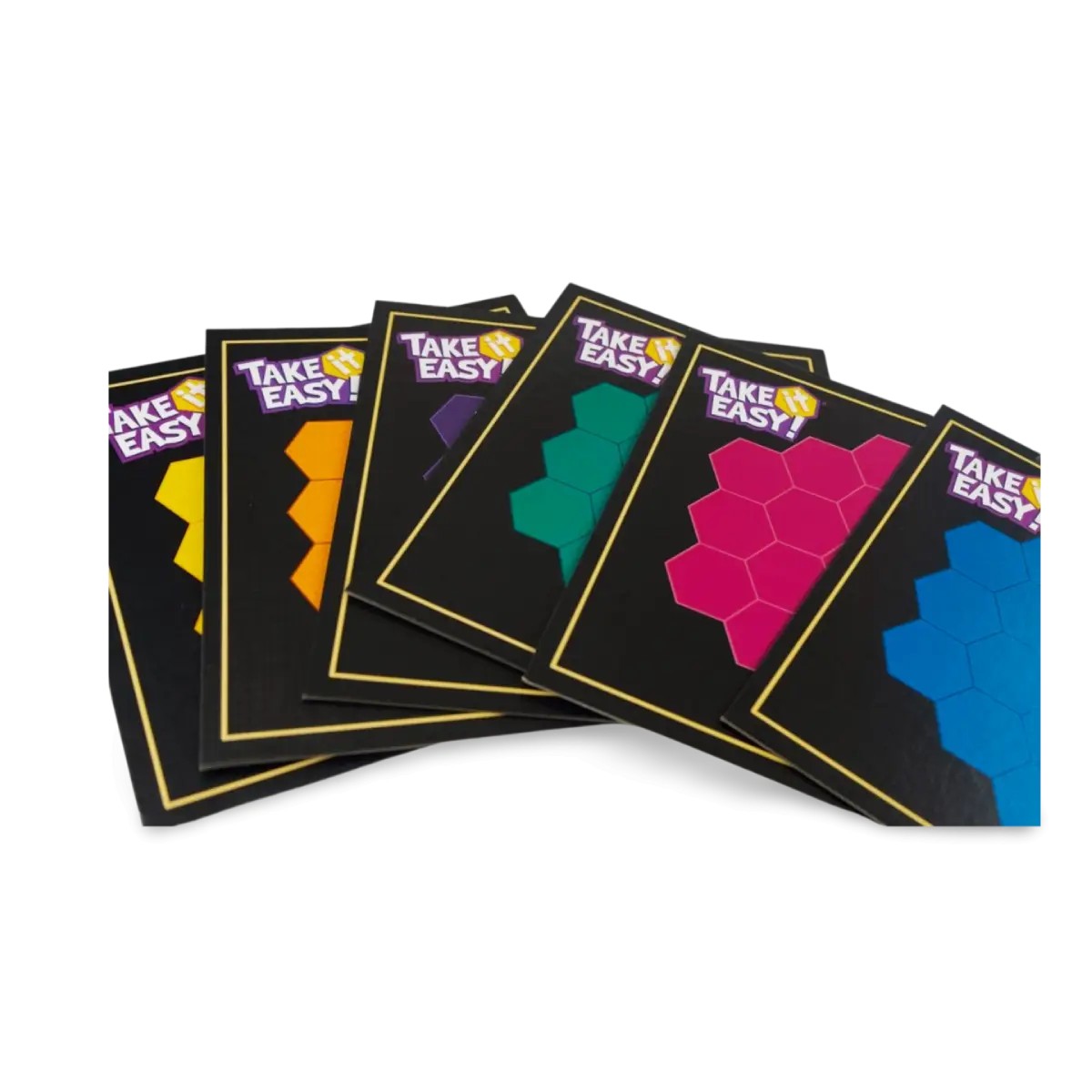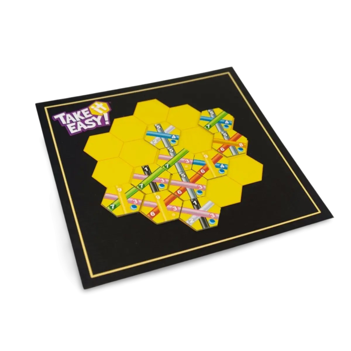 Take It Easy! es un juego donde crees que estás construyendo un precioso rompecabezas… hasta que descubres que, en realidad, estás compitiendo contra ti mismo para no llorar por una mala decisión estratégica. Cada jugador tiene su tablero hexagonal y un conjunto de fichas con líneas de colores que deben formar conexiones perfectas. Alguien grita un número, todos buscan la ficha correspondiente, y la colocan en su tablero, tratando de alinear líneas del mismo color para sumar puntos. Fácil, ¿no? Pues no. Cada nueva ficha puede ser tu salvación o el último clavo en el ataúd de tu gloriosa estrategia. Terminas la partida viendo líneas cortadas a mitad de camino y preguntándote por qué decidiste poner esa pieza ahí hace tres turnos. Entre suspiros, risas nerviosas y momentos de desesperación, “Take It Easy!” es como montar un tren de colores en marcha… solo que alguien te sigue cambiando las vías.