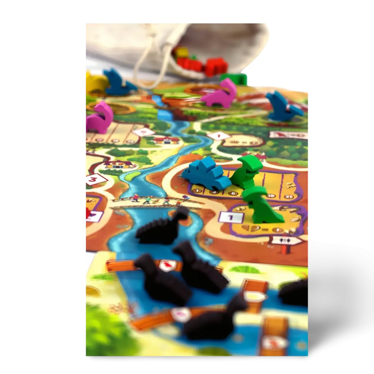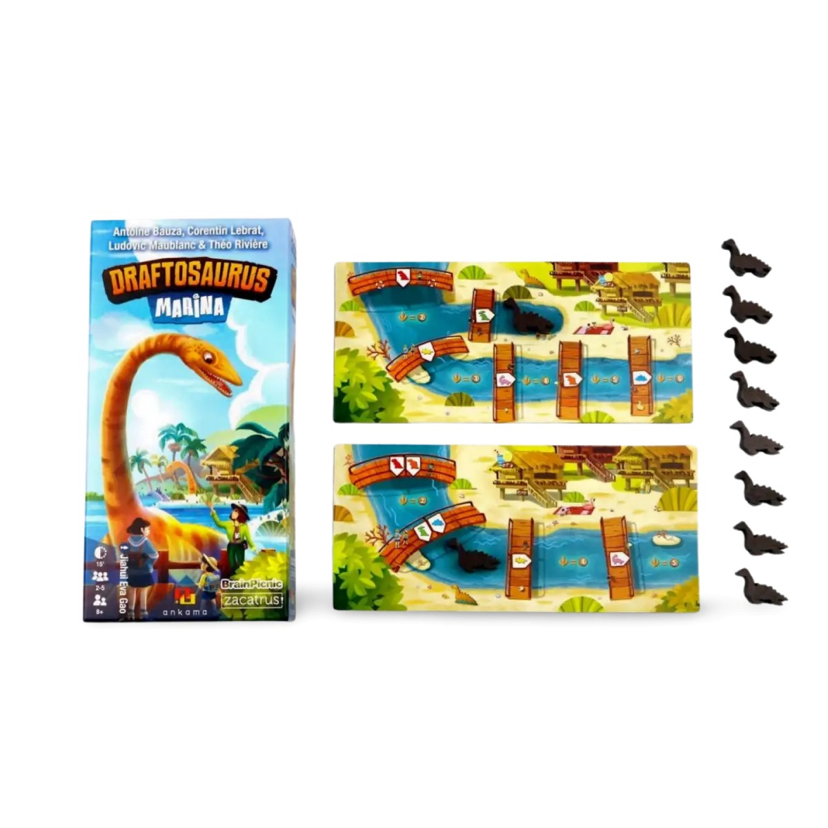 Draftosaurus: Marina añade dinosaurios acuáticos y un tablero extra de recintos acuáticos, llevando la estrategia del juego base a nuevas profundidades. Mientras intentas maximizar puntos con patrones acuáticos, también debes vigilar a tus rivales, porque cada elección puede hundir o hacer brillar tu parque jurásico.