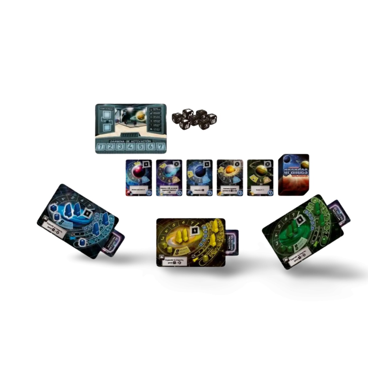 Pequeñas Grandes Galaxias es como construir tu propio imperio galáctico en una caja diminuta, donde cada turno es una mezcla de estrategia, gestión de recursos y pura ambición estelar. En este juego, compites con otros jugadores para expandir tu civilización, colonizar planetas y acumular puntos de victoria mientras equilibras tus acciones con un pool de dados que dictan tu destino.