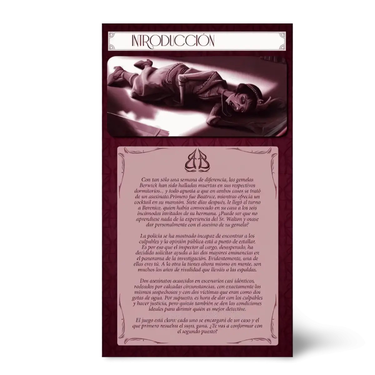En este juego de deducción para dos jugadores (o equipos), uno tomará el rol de la mente maestra, planeando cada detalle de un asesinato relacionado con las enigmáticas gemelas Berwick, mientras el otro será el detective encargado de desentrañar el misterio. Como mente maestra, elegirás quién cometió el crimen, con qué arma, y el móvil que lo justifica. Todo esto utilizando cartas y pistas que convierten el tablero en un rompecabezas de posibilidades.