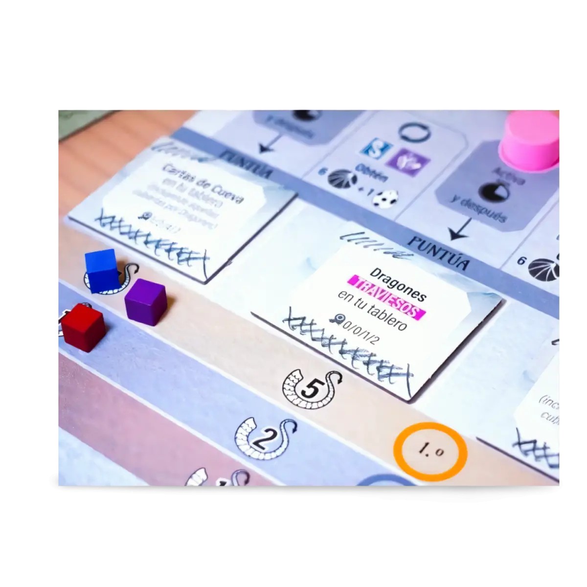 Todo esto sucede durante cuatro rondas llenas de decisiones interesantes, sabotajes amistosos (o no tanto) y ese glorioso momento en que finalmente logras atraer al dragón perfecto para tu cueva estrella. Al final, se cuentan los puntos de tus dragones, huevos y tus avances en el Gremio. ¿Quién será el maestro dracólogo? Solo uno lo logrará, pero el viaje estará lleno de momentos épicos y gloriosos rugidos.