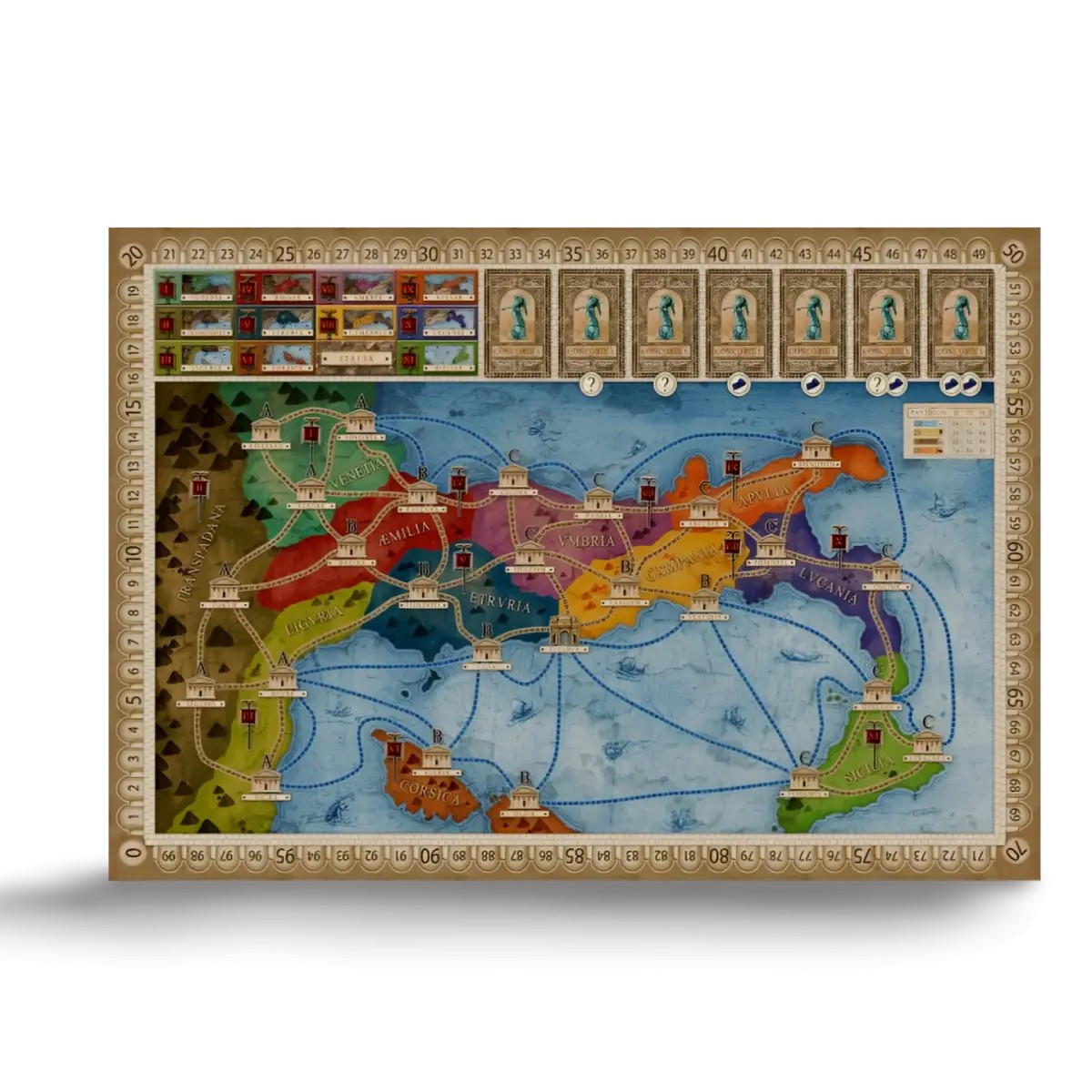 El tablero de juego representa el Imperio Romano con diversas provincias y ciudades que producen diferentes tipos de bienes: ladrillo, comida, herramientas, vino y tela. Los jugadores envían a sus colonos terrestres y marítimos para establecerse en estas ciudades y expandir su red comercial. La colocación estratégica de casas en las ciudades es crucial, ya que determina la producción de recursos y las oportunidades de comercio.