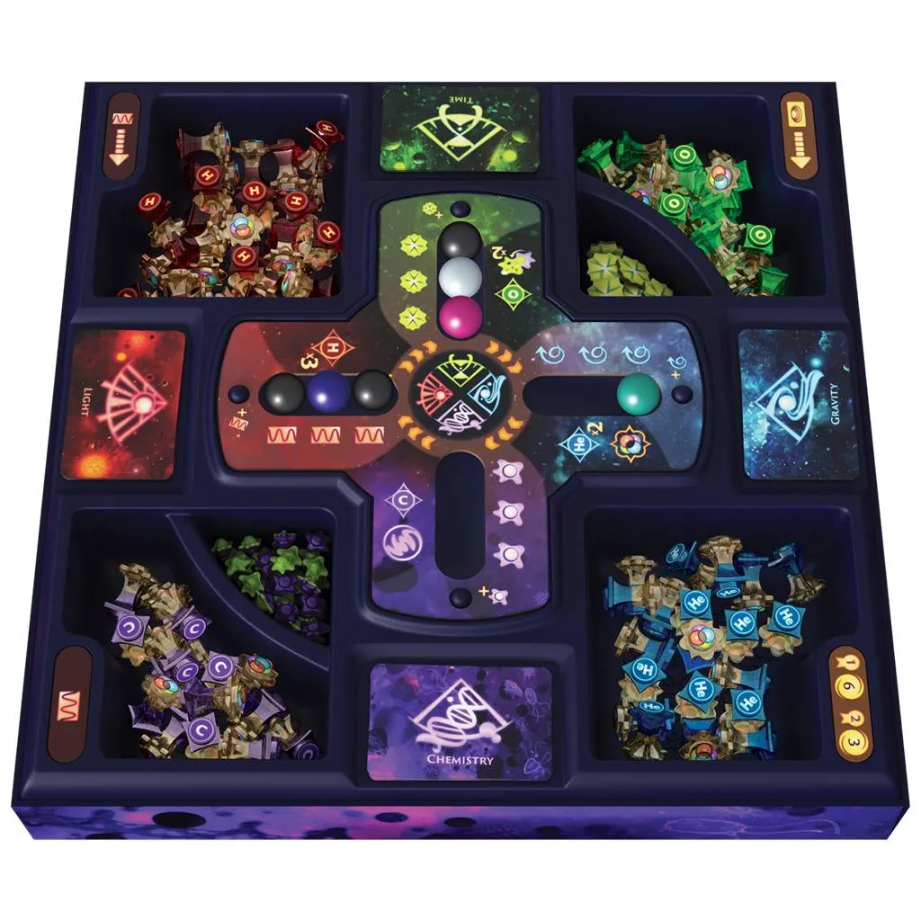 Crea el Cosmos arranca con cada jugador movilizando energía mediante canicas sobre el tablero principal para reunir los bloques básicos del universo: hidrógeno, helio, carbono y oxígeno. Tras la fase de recolección, gastas esos recursos en tu cuadrícula personal, colocando estrellas, nebulosas y protovida en un puzle tridimensional donde encadenar cadenas de puntuación y activar cartas de poder resulta tan satisfactorio como estratégico. A lo largo de la partida compites por cumplir objetivos universales —desde completar regiones de nebulosas hasta desarrollar formas de vida avanzadas— todo mientras gestionas cartas de energía que te permiten alterar las leyes físicas a tu favor. Con partidas de unos 90 minutos y mecánicas de construcción de motor profundas, cada galaxia rival emerge única, poniendo a prueba tu habilidad para equilibrar creación, control y expansión cósmica sin sucumbir ante la presión gravitatoria de tus oponentes.
