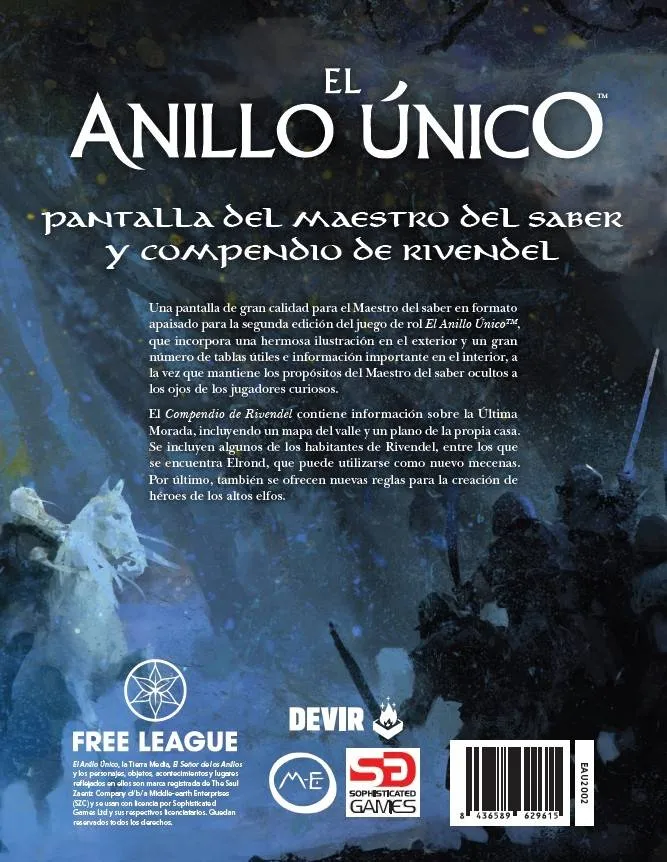 El Anillo Único 2ª ed.: Pantalla + Compendio de Rivendel reúne en un único pack una pantalla de cinco paneles con toda la información crucial—desde tablas de combate y coraje hasta guías rápidas de pericia élfica—y un compendio de 96 páginas que expande la geografía, la historia y los secretos de Imladris. En el suplemento encontrarás no solo mapas detallados y descripciones de lugares como la Sala de los Consejos o la Casa de Elrond, sino también aventuras cortas, variantes de reglas para reflejar el ingenio y la longevidad de los elfos, y una antología de historias y rumores que aportan sabor literario a cada encuentro. Diseñado para agilizar tu labor como guardián de la Tierra Media, elimina la fricción de pasar páginas durante el juego y ofrece inspiración constante: entre sus perfiles de PNJ, descripciones de artesanía élfica y fragmentos de poemas ancestrales, descubrirás nuevas maneras de que tus Compañías huyan, luchen y sueñen bajo las bóvedas de Rivendel. Cada sección del compendio está estructurada para usarse al vuelo, con recuadros de reglas, consejos de ambientación y tablas de rumor que convierten cualquier desvío en una oportunidad narrativa, mientras la pantalla te mantiene al tanto del pulso de la partida sin apartar la vista de la mesa.