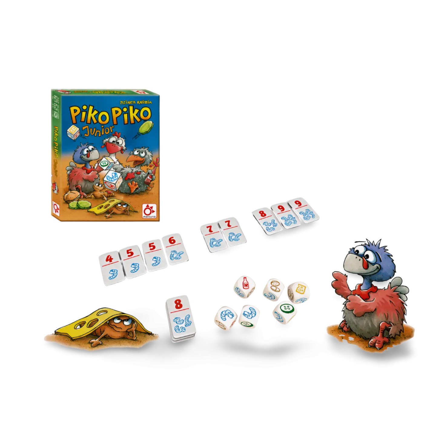 Piko Piko Junior es un juego de dados donde los pequeños suman, arriesgan y compiten por conseguir más gusanos para sus pollos. Es rápido, divertido y perfecto para introducir a los niños al mundo de los juegos de mesa.