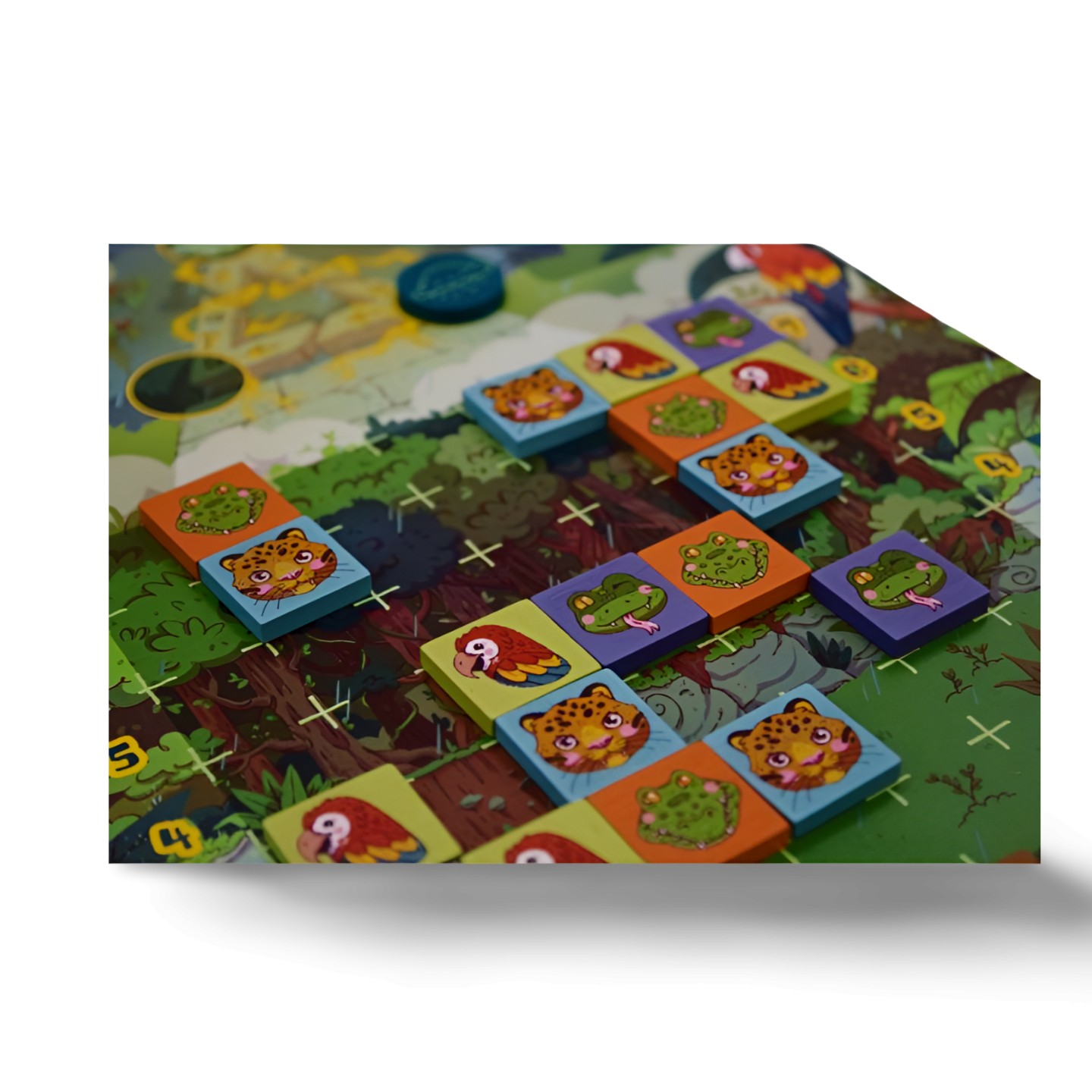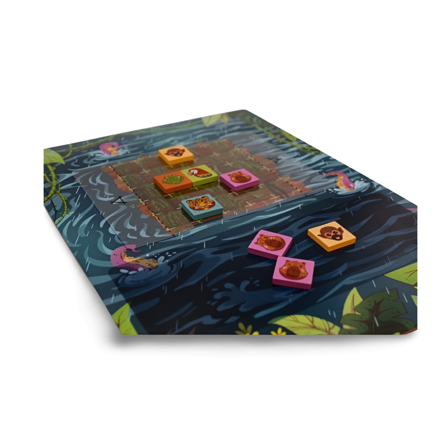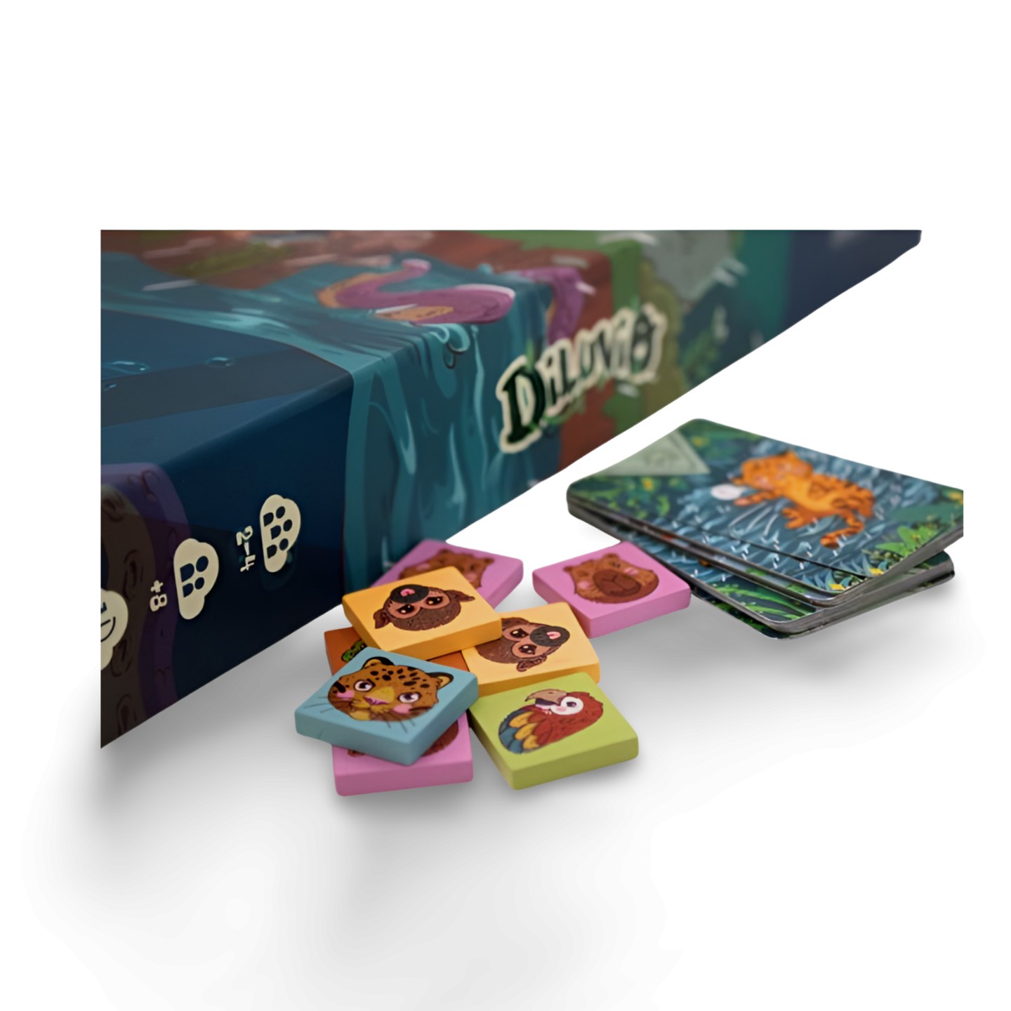 El juego se desarrolla en un tablero que representa la selva y el mar, con una balsa que avanza inexorablemente, recordándote que el tiempo se agota. Las cartas de acción permiten movimientos estratégicos, desde avanzar rápidamente hasta provocar un tsunami que reordene el tablero. La clave está en planificar tus movimientos para llevar a tus animales al arca antes de que el agua los alcance, mientras obstaculizas a tus contrincantes. Con partidas de aproximadamente 20 minutos y diseñado para 3 a 4 jugadores a partir de 8 años, Diluvio ofrece una experiencia dinámica y llena de decisiones tácticas que pondrán a prueba tus habilidades de planificación y adaptación.