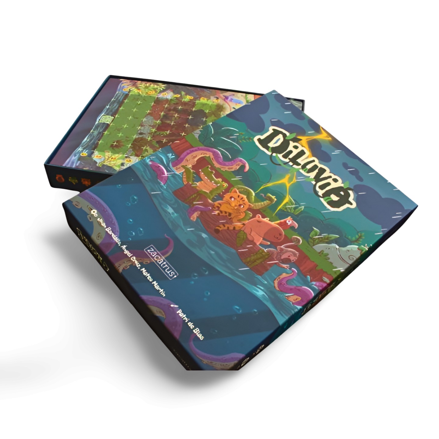 Diluvio es un juego de mesa en el que compites por salvar a tu especie animal de un diluvio inminente, asegurando asientos en el arca mediante estrategias y movimientos tácticos.